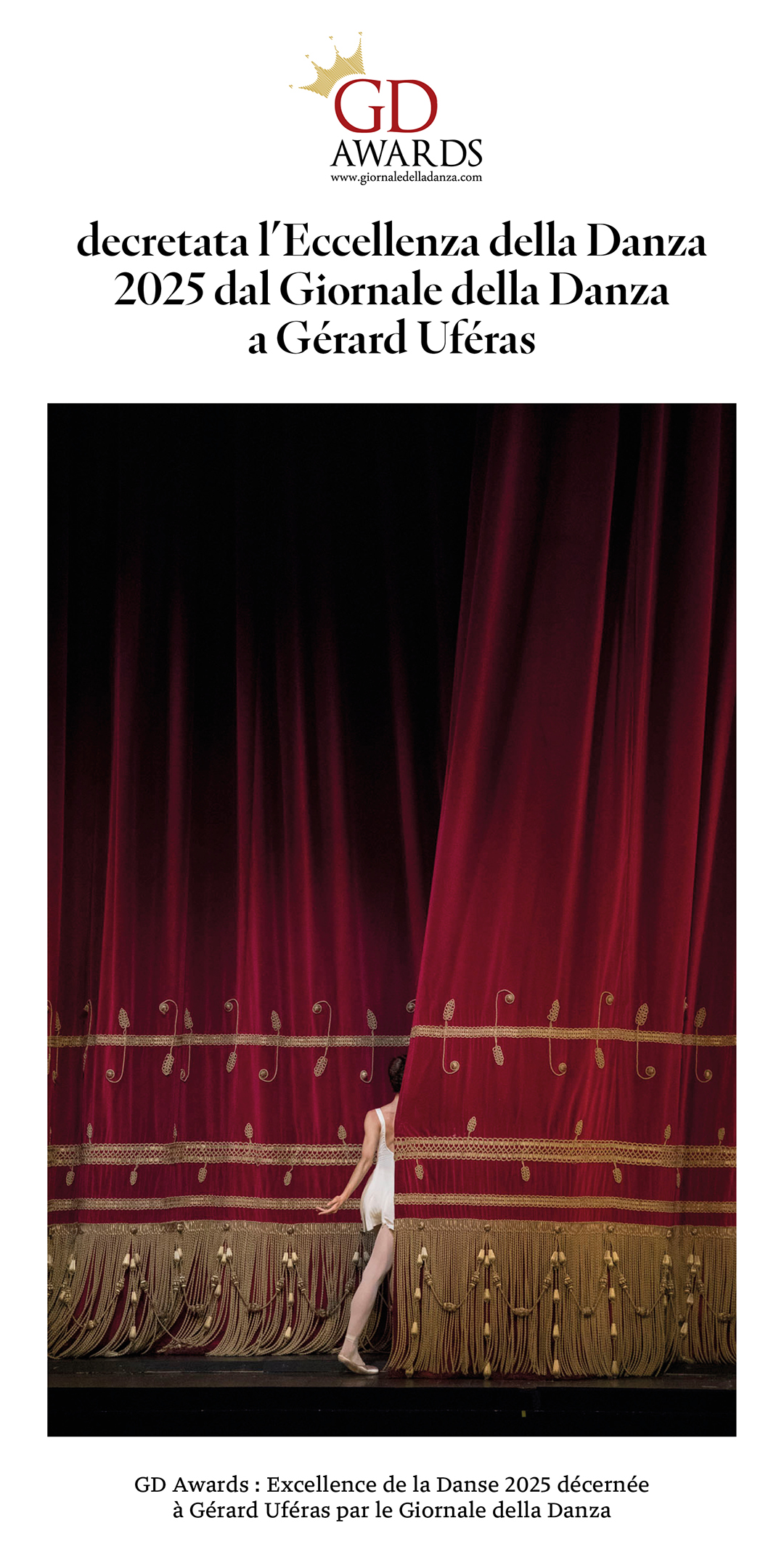 Cette année, comme le veut la tradition depuis 2010, Giornaledelladanza.com, ses lecteurs, toute la rédaction, la directrice Sara Zuccari, la directrice adjointe Lorena Coppola et le rédacteur en chef et coordinateur des prix Michele Olivieri ont annoncé l'excellence de l'Année de la danse lors des GD Awards 2025. "Lo sguardo nascosto" l'exposition de Gérard Uféras sur le ballet du teatro alla Scala a été récompensé d'un GD Award