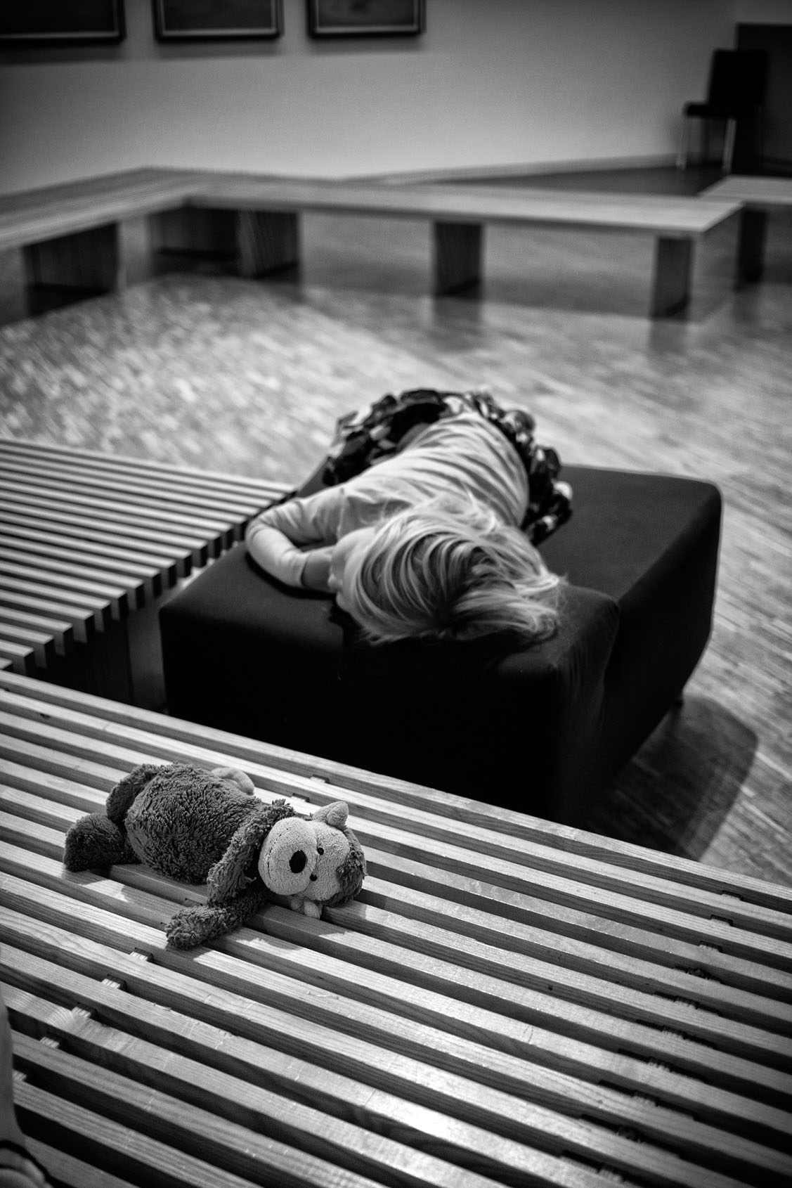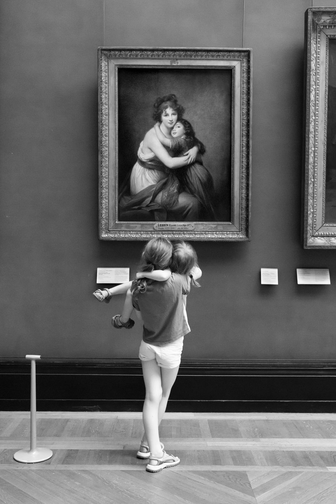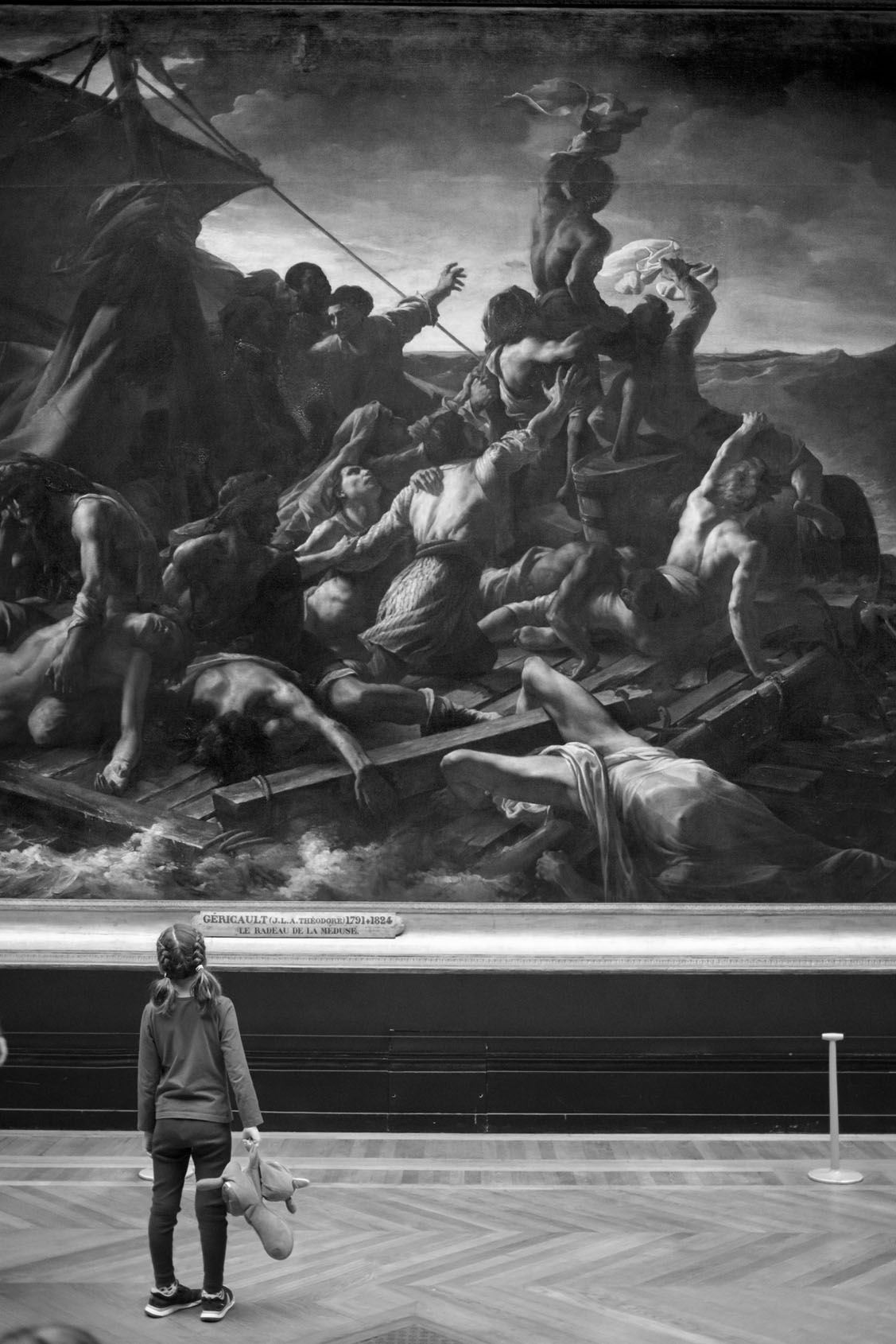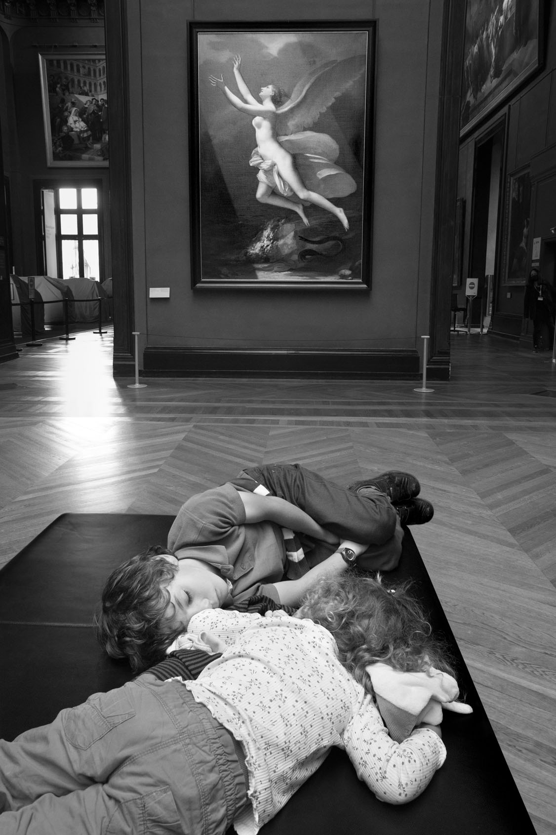 Just as Eugène Atget created a detailed record of Paris during his strolls around the city at the dawn of the 20th century, Gérard Uféras secures evidence for his documentary account in museums. In this environment he renders himself virtually invisible. Thus he manages to create, from a great distance, astonishing observations with immense intimacy, capturing insights into the souls of the museum visitors which are at the same time deeply personal, humorous and striking. He possesses a very special instinct for the open gaze of children at great works of art – though he also shows them unimpressed, sometimes exhausted, playing with soft toys on the floor or a bench at a museum, or falling asleep. Here his images are of almost tender attentiveness. The museum becomes the stage of the human, the all too human. Gérard Uféras captures these moments to perfection, reclaiming the museum – which too often becomes a mausoleum – for the living present.